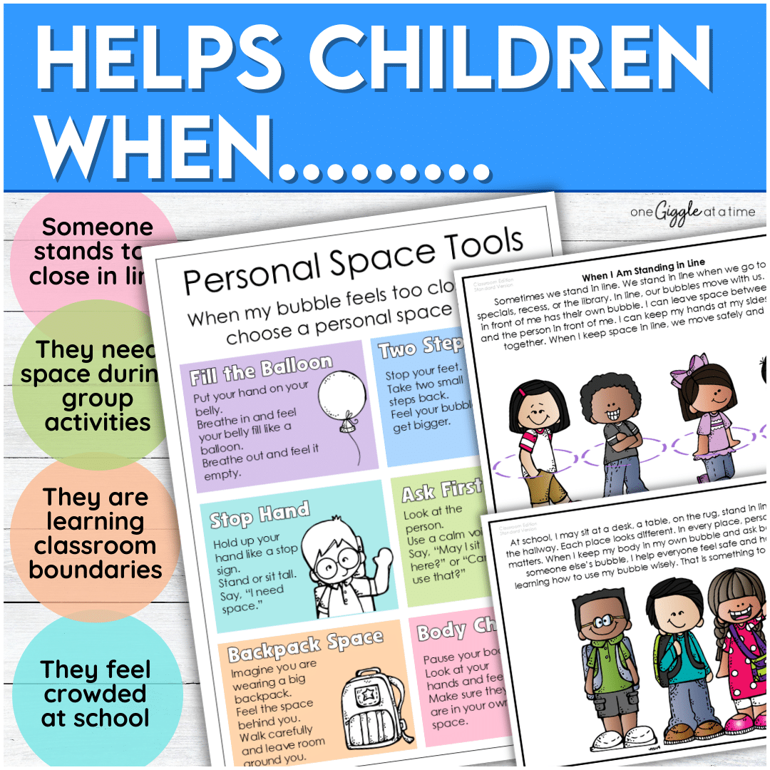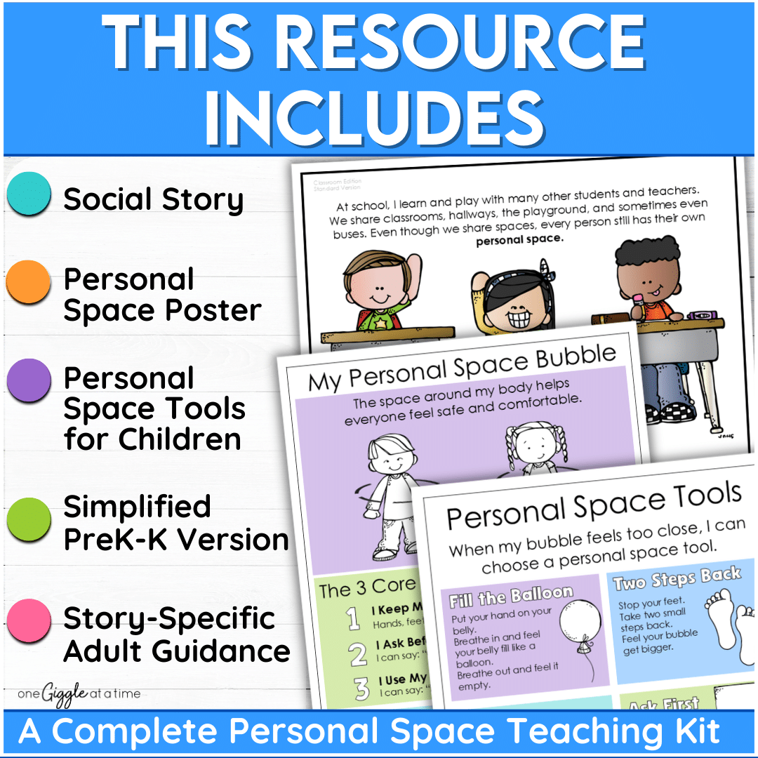 Teach respectful classroom boundaries with this Personal Space Social Story for the classroom.ย Thisย personal space and boundaries social story with visual supportsย helps young learners understand how to keep hands, bodies, and belongings in their own space during desks, tables, rug time, hallways, playgrounds, and bus lines.